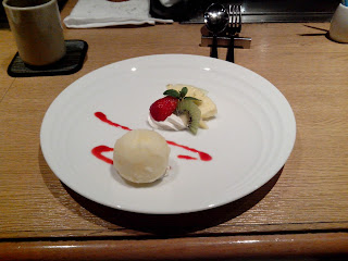 Time for dessert. It's a sorbet with cream and fruits. A perfect ending...
